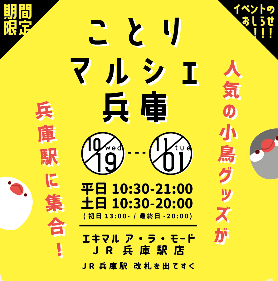 小鳥グッズ業界の大イベント「鳥フェス」や各地の催事に出展。オリジナル商品を展開している「ことりカフェ心斎橋」が、アクセスに便利な「JR兵庫駅」に期間限定ショップをオープンしました。
