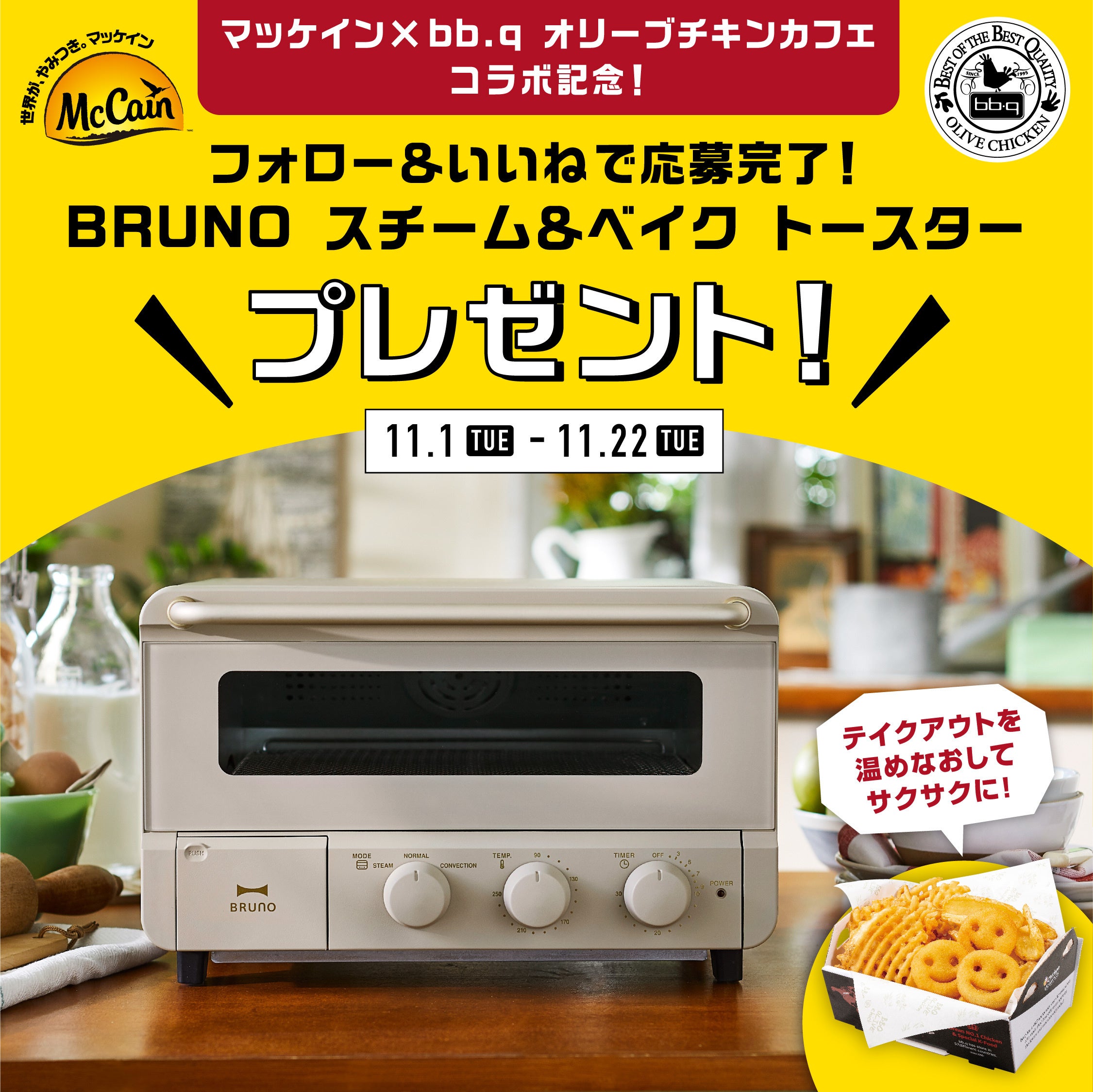 さらにマッケインのInstagramにおいても、「フォロー&いいね プレゼントキャンペーン」を実施。抽選で1名様に、チキンやフライドポテトの温めなおしに活躍する「BRUNOスチーム&ベイク トースター」をプレゼントします。