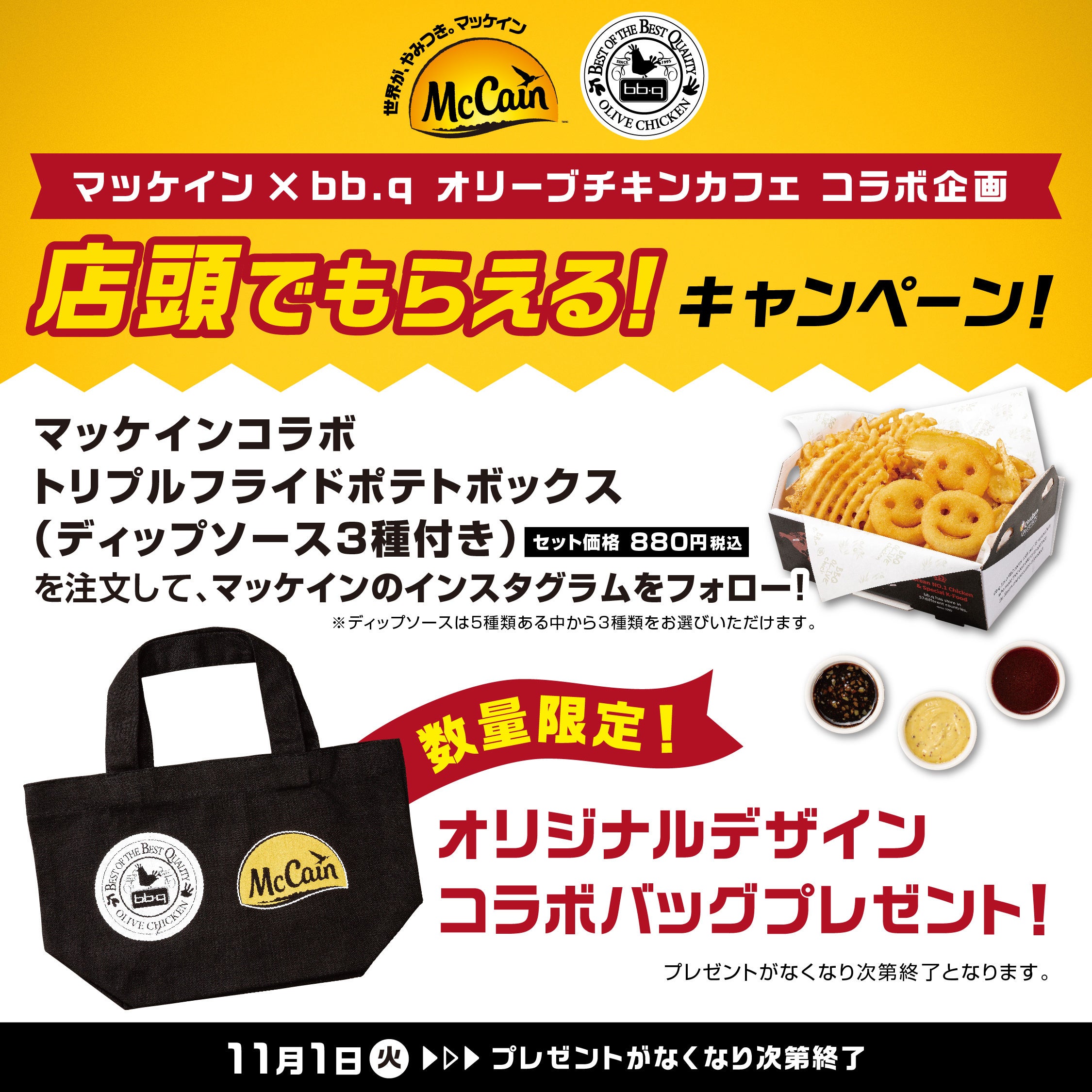 世界最大のフライドポテト製造メーカー、McCain Foods Limited(本社:カナダ・トロント、CEO:Max Koeune、以下「マッケイン・フーズ」) の日本法人、日本マッケイン・フーズ株式会社(本社:東京都港区、代表取締役:アンソニー・ロビンソン、以下「マッケイン」)は、NO.1韓国チキンブランド・bb.qオリーブチキンカフェ(以下「オリーブチキンカフェ」)とコラボし、「WE LOVE POTATOダブルキャンペーン」を11月1日から国内全店舗とInstagramで実施します。