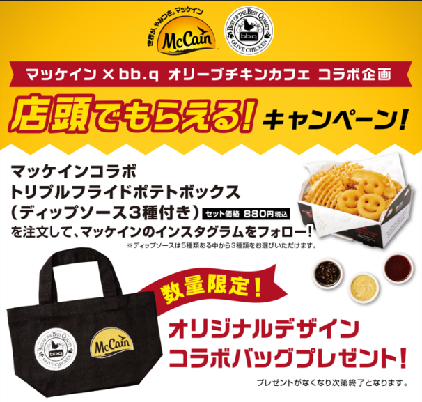 今回開催する「WE LOVE POTATOダブルキャンペーン」では、チキンのお供として定番のフライドポテトのスペシャルメニューを用意。マッケインの人気フライドポテト3種(クリスパーズ、スマイルポテト、ワッフルポテト)をbb.qオリーブチキンカフェ自慢のディップソース3種で楽しめる「トリプルフライドポテトボックス(ディップソース3種付き)」(税込880円)を国内全店舗で販売いたします。さらに、こちらの商品をご注文のうえ、マッケインのInstagramをフォローいただいた方には「オリジナルデザイン コラボバッグ」をプレゼントします(数量限定。無くなり次第終了)