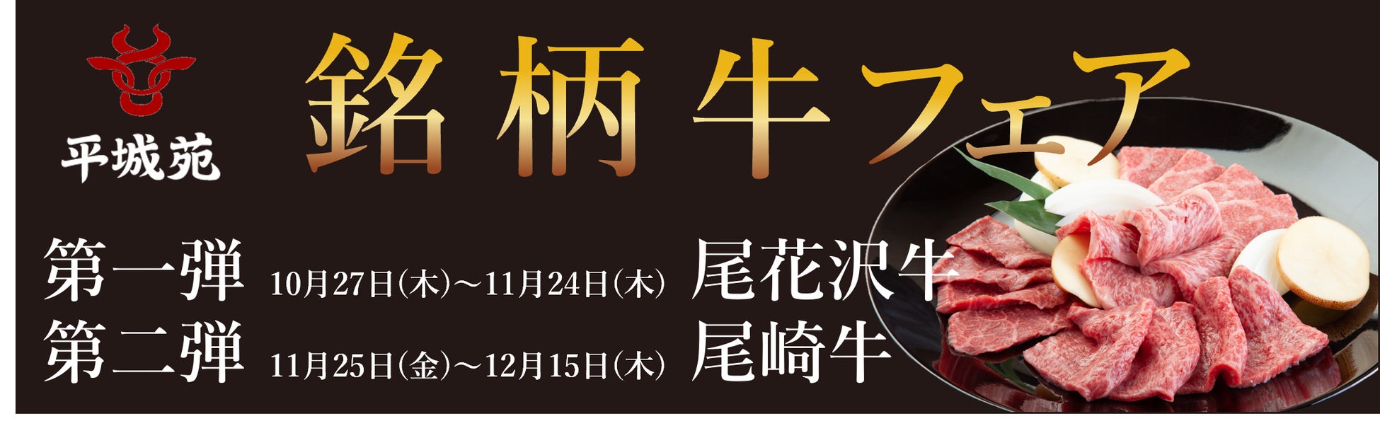 高級焼肉チェーン『平城苑』を展開する株式会社平城苑(本社:東京都足立区 / 代表取締役社長:鏑木 順之)は、山形県「尾花沢牛」、宮崎県「尾崎牛」を使用した『銘柄牛フェア』を10月27日(木)~12月15日(木)の期間限定で開催します(一部店舗を除く)。