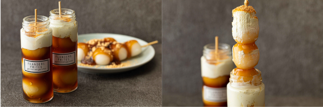 老舗団子屋さんとのコラボにてお芋とみたらし団子の和スイーツが出来ました。団子はもちもちっと柔らかく甘さをほんのりのせた一口サイズの串団子。みたらしは特製の焼き醤油の甘タレに仕上げていて焼いたお餅のような香ばしさも拡がります。上の層のお芋のスイートクリーム、きなこと一緒に召し上がる和スイーツです。