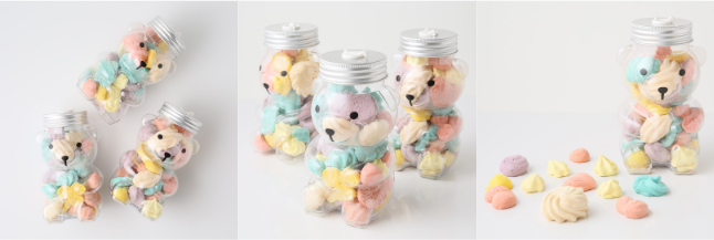 さくっ。シュワっ。とした口溶けが楽しいメレンゲの缶と、サクサク食感のシュガーバターポップコーンの缶をご購入できます。フタ部分にゴム蓋が付いているので、食べ終わった後もドリンクボトル等にご利用頂けます。