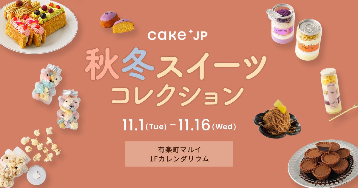 ケーキ・スイーツ専門通販サイト「Cake.jp(ケーキジェーピー)」を運営する株式会社Cake.jp(本社:東京都新宿区、代表取締役:高橋 優貴)は、マルイ有楽町(株式会社丸井、本社:東京都中野区、代表取締役社長:青野 真博)にて「Cake.jp 秋冬スイーツコレクション 」を11月1日から11月16日まで期間限定でオープンします。