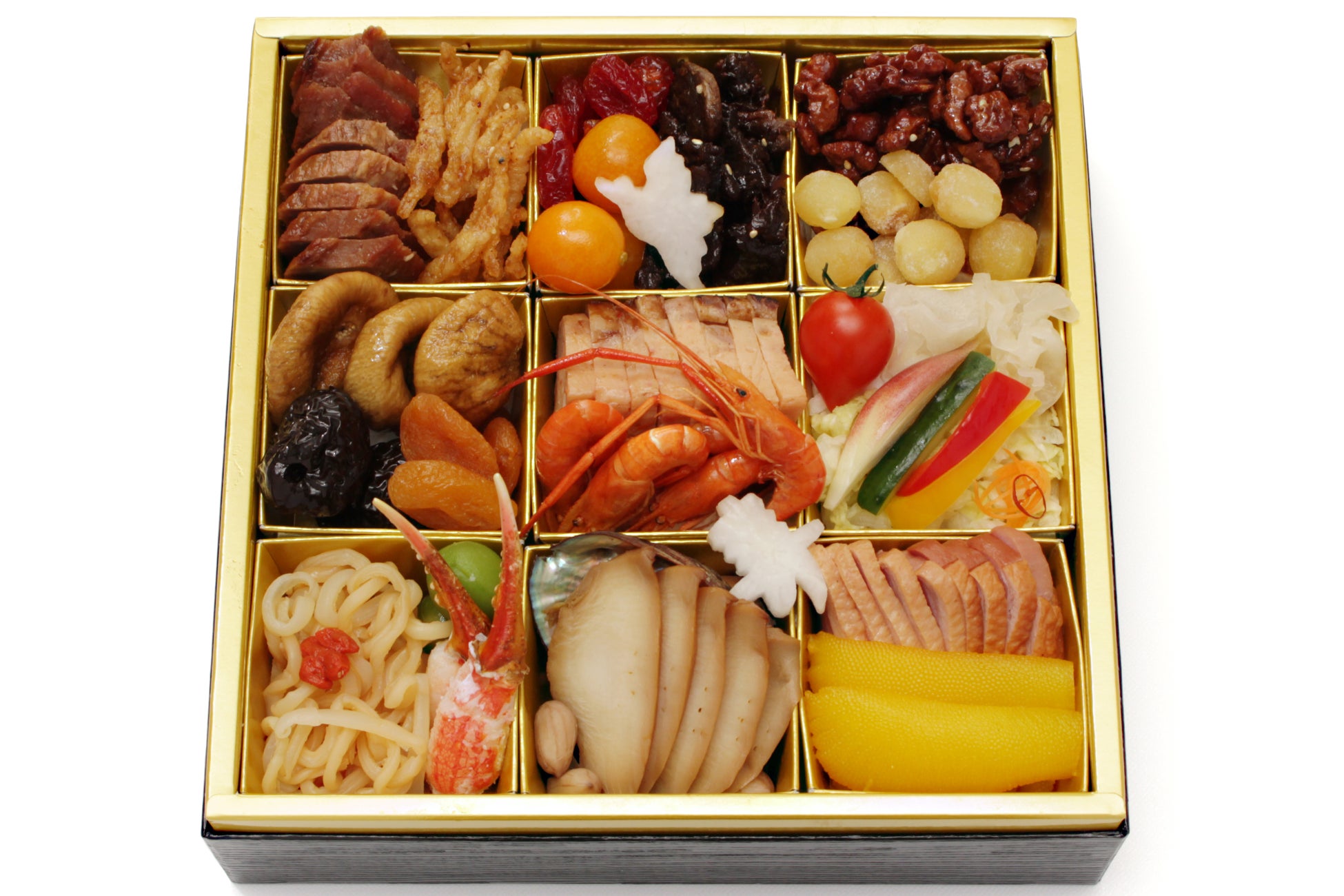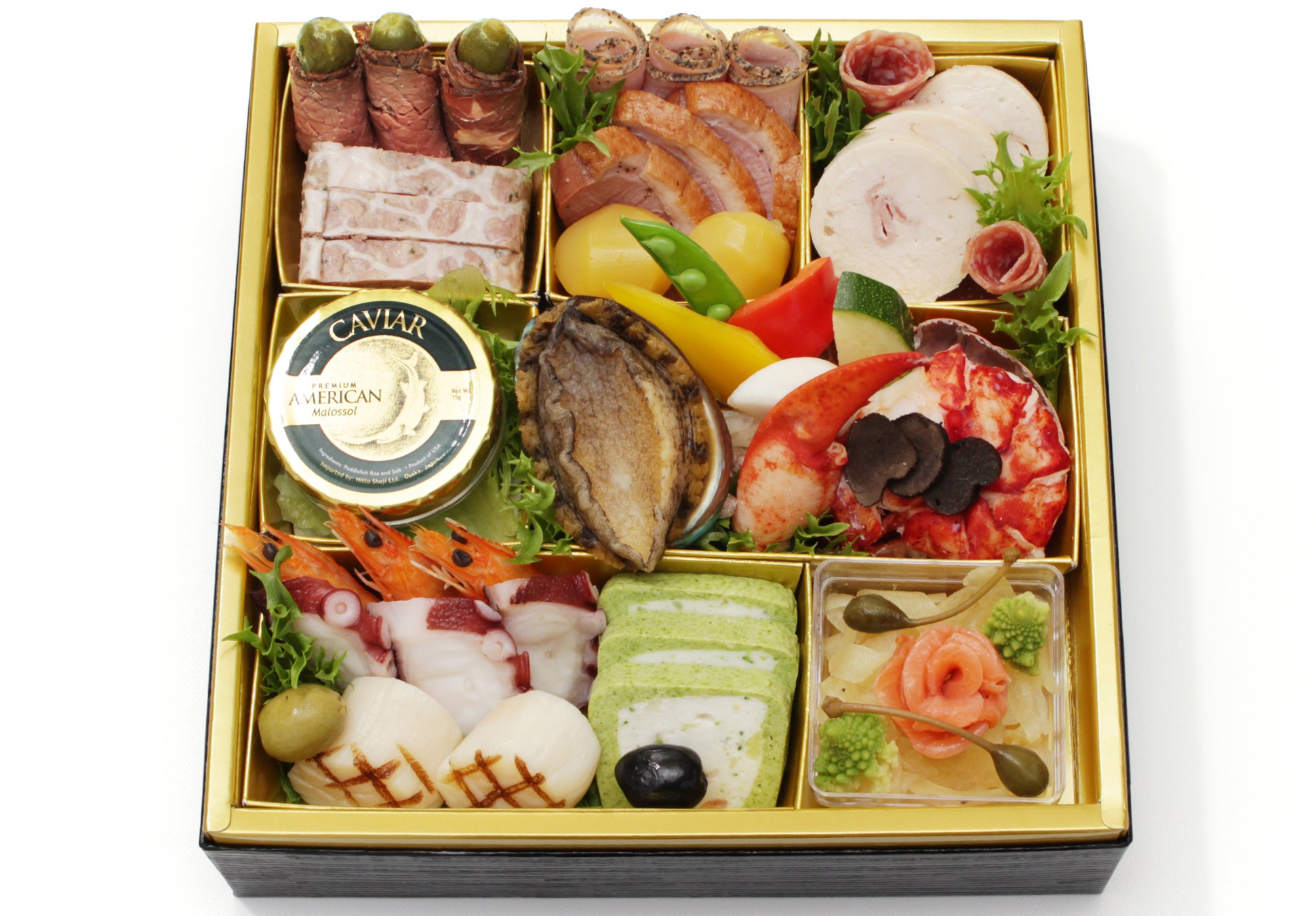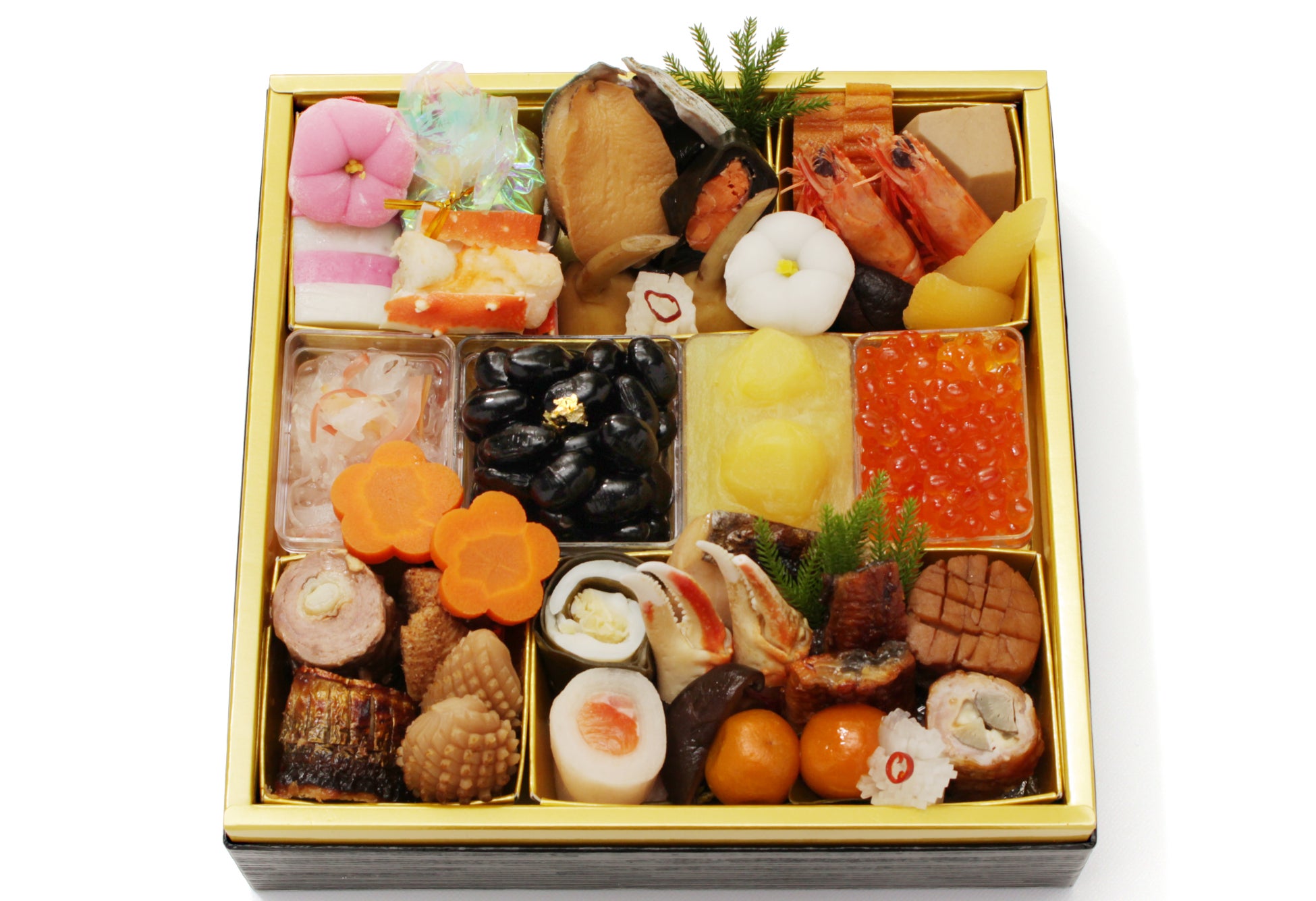 紅白生酢/黒豆/秋刀魚巻繊巻/松笠烏賊生姜煮/筍土佐煮/国産牛南蛮巻/梅人参/葉付金柑/ズワイ蟹爪旨煮/鰆柚庵焼き/豚肉チーズ八幡巻/サーモン奉書巻/帆立ピリ辛煮/鮭昆布巻/鯛龍皮昆布巻/鰻蒲焼き/栗金団/いくら醤油漬け/椎茸旨煮/数の子/海老芋田舎煮/有頭海老艶煮/伊達巻/紅白市松蒲鉾/六方慈姑/菊花蕪/紅白花餅/抹茶蕨餅オーロラ包み/鮑旨煮/鱈場蟹の南蛮漬け