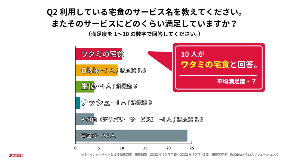 Q2 オイシックス、ワタミの宅食が多く、平均満足度は高め。