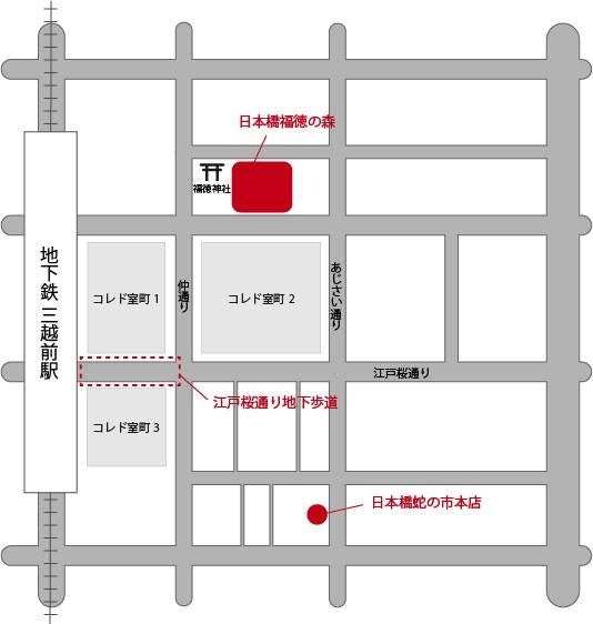 日本橋福徳の森 [東京都中央区日本橋室町2-5-10](雨天の場合、三越前駅直結 江戸桜通り地下歩道)