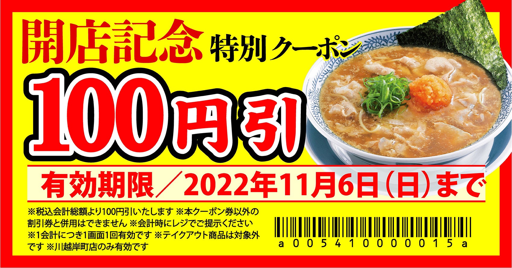 株式会社物語コーポレーション(本社:愛知県豊橋市/代表取締役社長:加藤 央之)が運営する『丸源ラーメン』は、2022年10⽉28日(金)に、全国184店舗目となる『丸源ラーメン 川越岸町店』(埼玉県川越市)をグランドオープンいたします。オープン記念として、2022年11⽉6⽇(日)まで『丸源ラーメン 川越岸町店』のみでご利⽤いただける100円引クーポンを配布します。