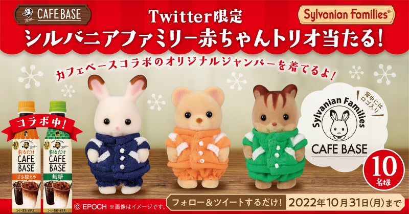 この度のコラボレーションでは、サントリー食品インターナショナルが販売する「ボス カフェベース」とコラボしたオリジナルジャンパーを着た「シルバニアファミリー」の赤ちゃん3にんセットが計10名様に当たるプレゼントキャンペーンを、カフェベース公式Twitter( @boss_cafebase )にて開催いたします。