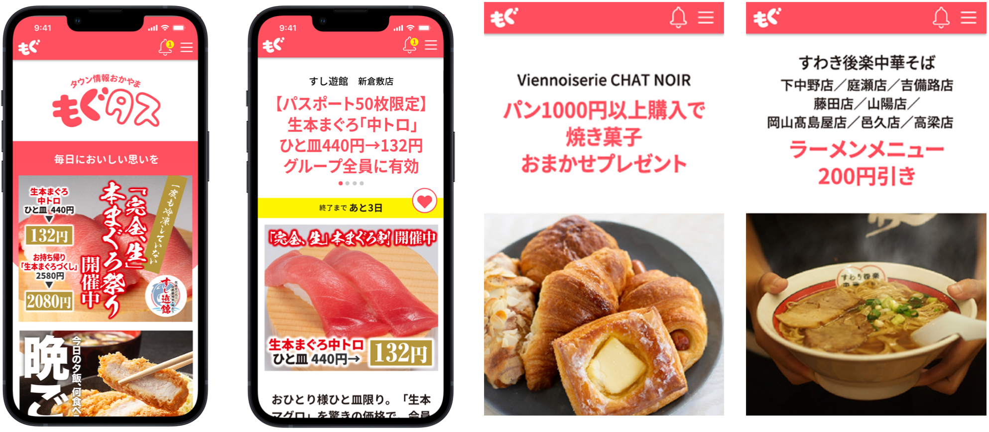 お得にメニューを楽しめる「割引」や、うれしい「無料・プレゼント」、もぐタスだけの「特別メニュー」など、会員だけが受けられる特別なサービスが満載!