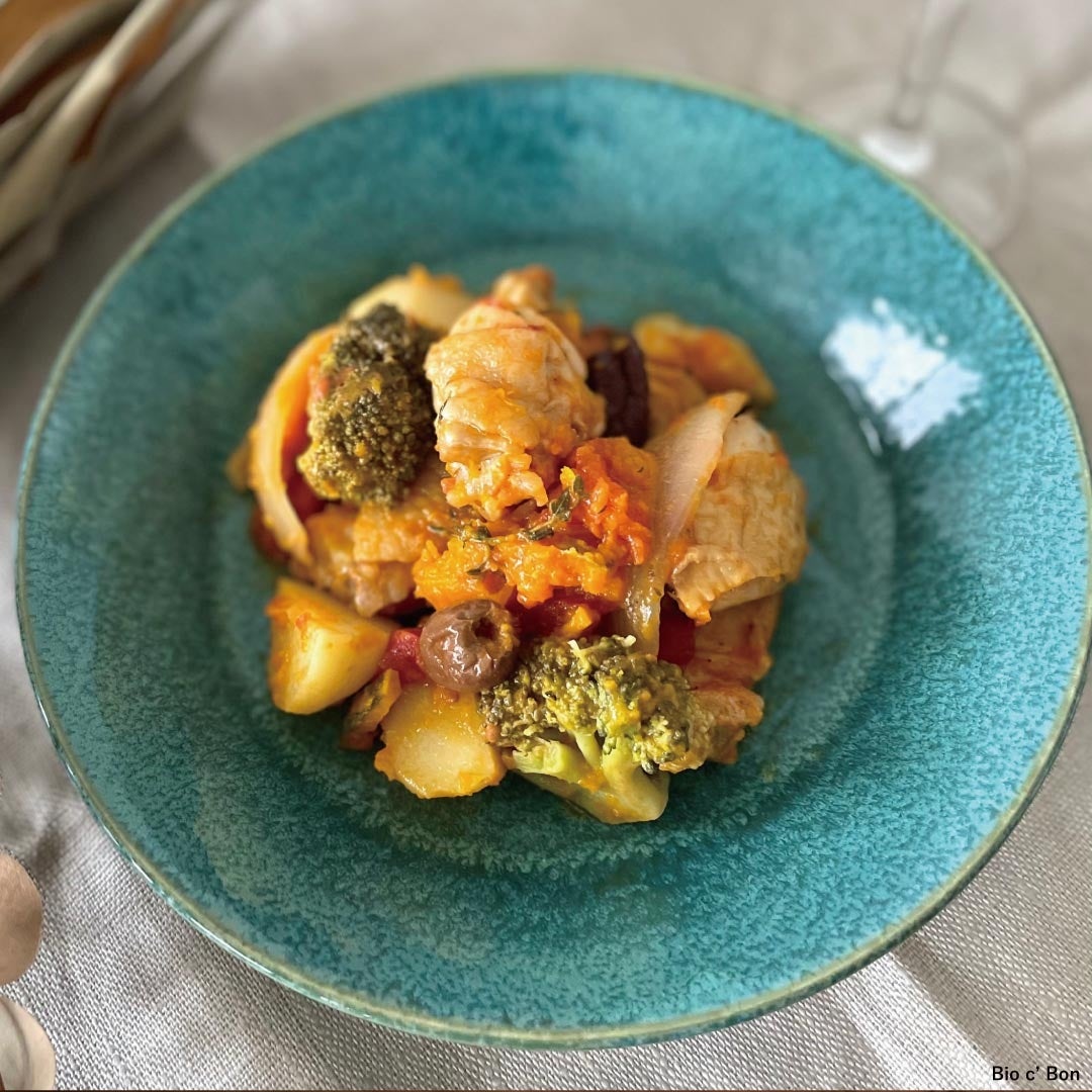 プロヴァンス地方の郷土料理を参考にした一品です。鶏肉の皮目をカリッと焼き上げながら、トマト、オリーブ、ハーブ類でじっくり煮込んでいます。