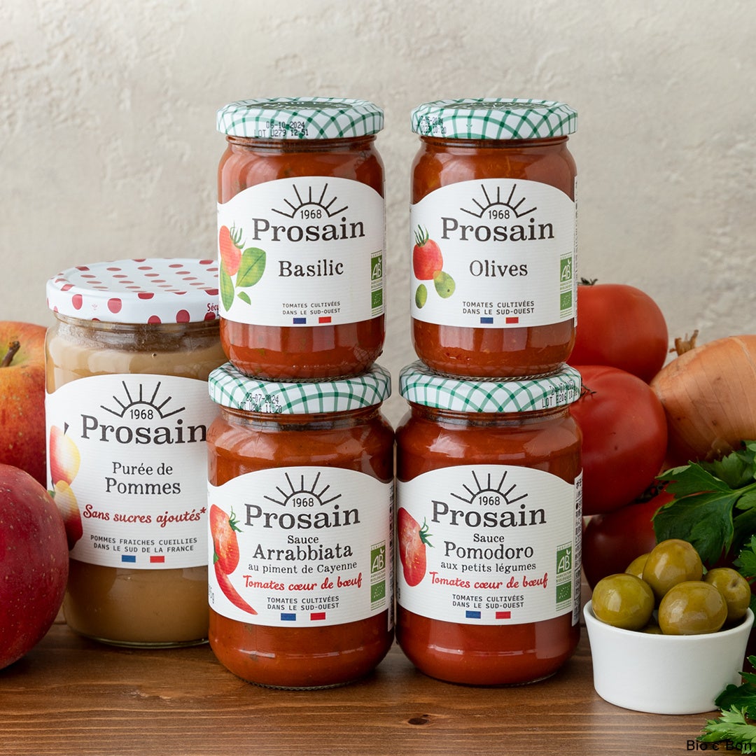 ①有機アップルピューレ、②トマトソース(バジル)③トマトソース(オリーブ)、④トマトソース(アラビアータ)⑤トマトソース(ポモドーロ)