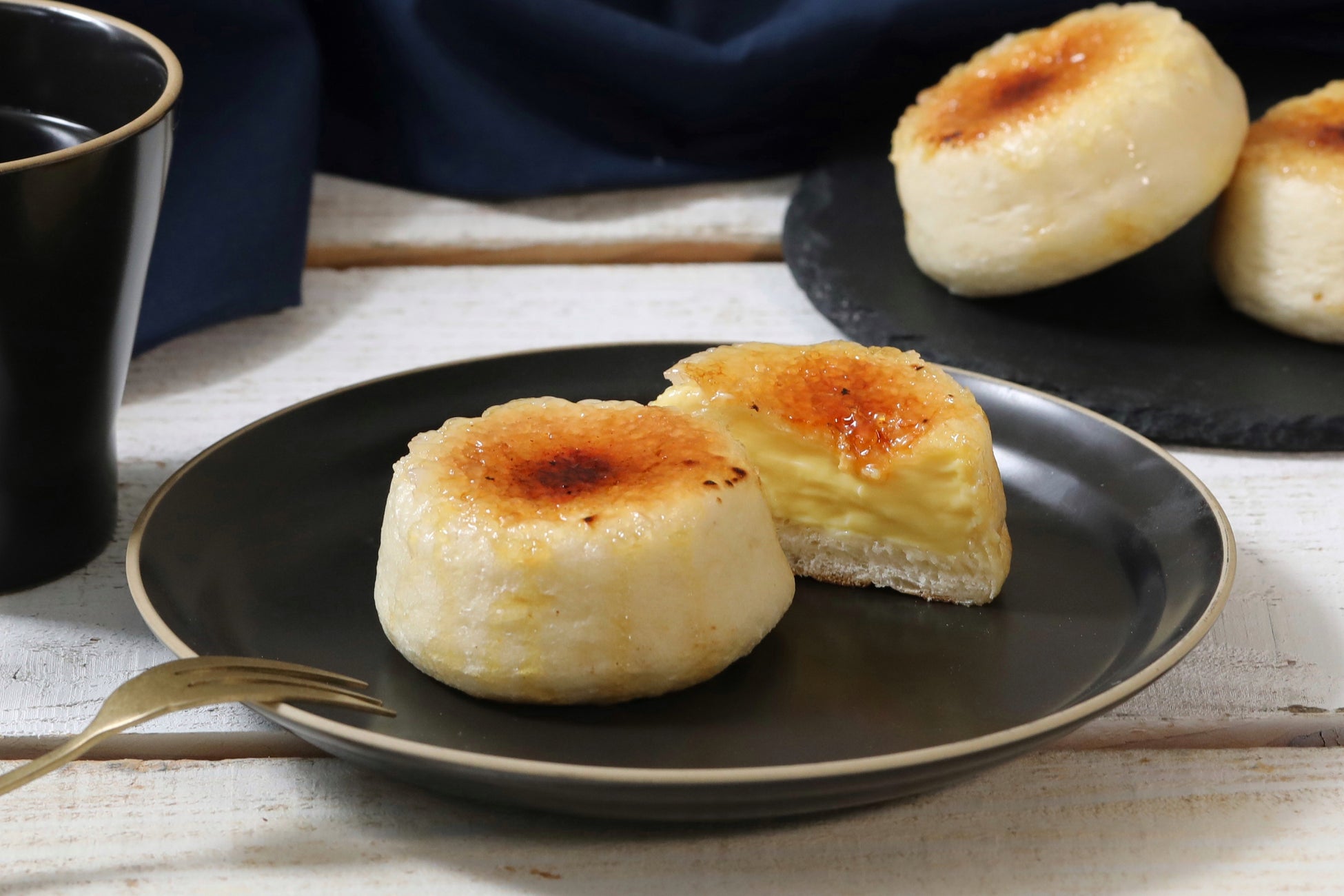 もちもち、しっとりとした生地と優しい甘さのカスタードのなめらかなくちどけ、そして表面のカリカリした食感のコントラストをお楽しみください。