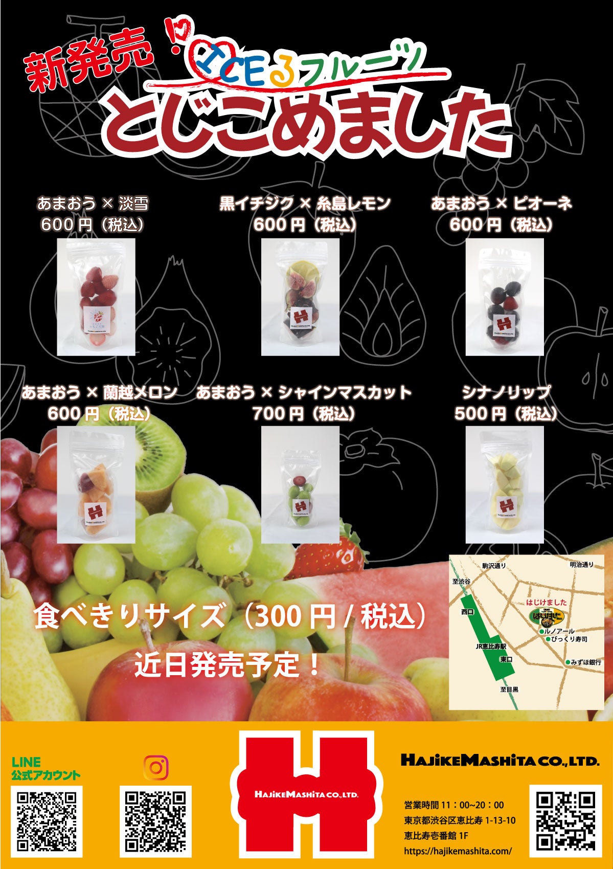 また、2022年8月23日より【HAJIKE ONLINE SHOP】で販売開始した冷凍熟成フルーツ【ICEるフルーツ とじこめました】の店頭販売も開始しました。