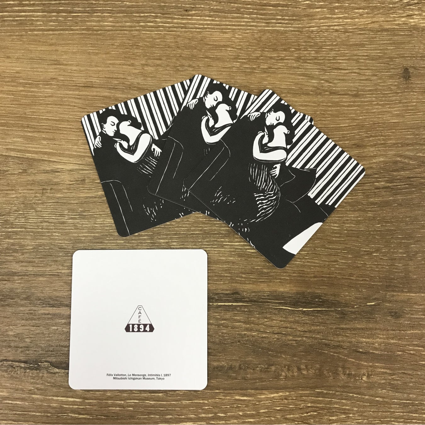 下記のメニューをご注文いただいたお客様に、ヴァロットン作品をデザインしたオリジナルコースターをプレゼントします。1名様1枚まで。数量限定のため、無くなり次第終了となります。予めご了承ください。※営業終了時間変更の可能性あり。Café 1894サイト https://mimt.jp/cafe1894/ をご確認ください。