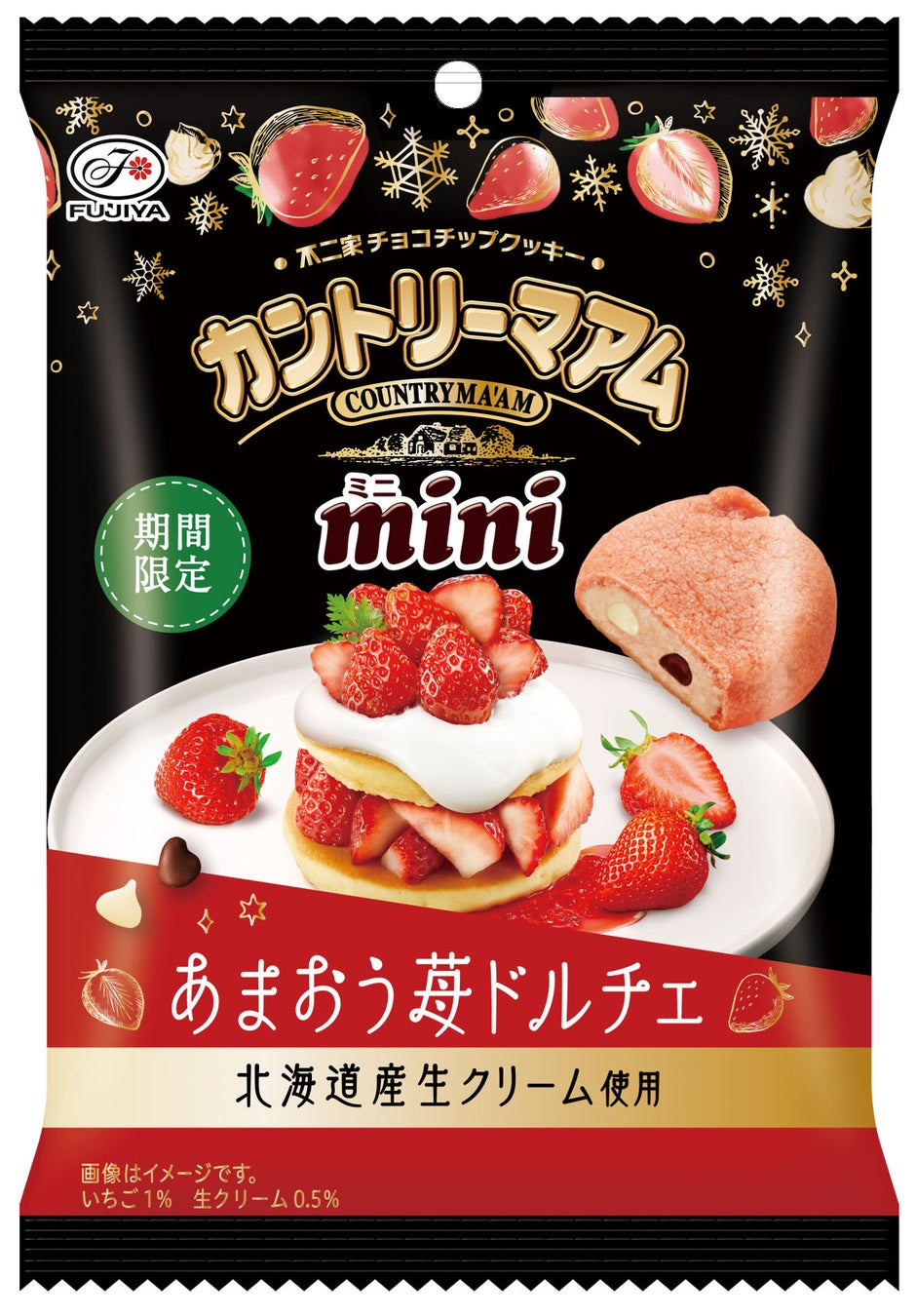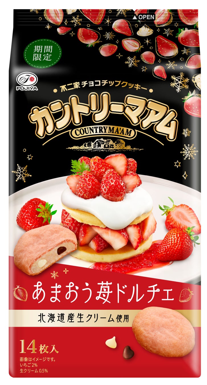 ・あまおう苺の果汁と北海道産生クリームを生地に練り込み、口どけの良いホワイトチョコチップとスイートチョコチップを合わせて焼き上げ、「苺のドルチェ」をイメージした贅沢感を愉しめる期間限定カントリーマアム
