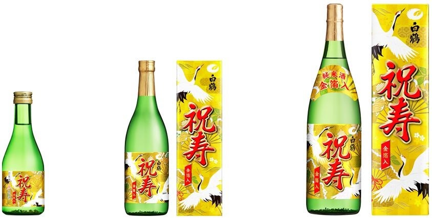 商品特長 米と米こうじ、水だけで仕込んだまろやかですっきりとした後味が特長の純米酒に、華やかな金箔を加えました。「祝寿」の名にちなみ、鶴などの長寿の象徴やおめでたいモチーフで華やかに飾りたて、金箔の屏風絵のような優雅な世界観を演出し、高級感を高めた煌びやかな意匠に仕上げました。