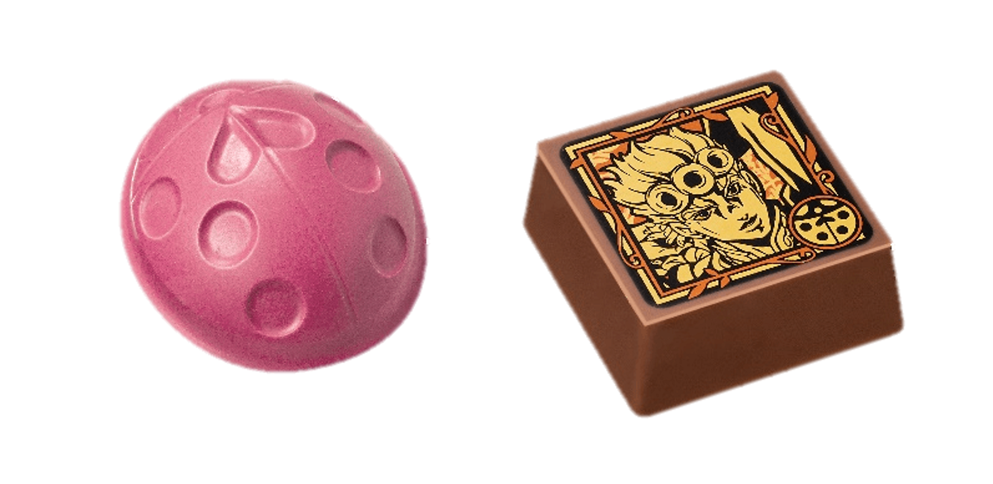 主人公「ジョルノ・ジョバァーナ」が身に付ける「てんとう虫のモチーフアクセサリー」をかたどったホワイトチョコレートと、ジョルノを描いたキャラメルフィリング入りのミルクチョコレート。