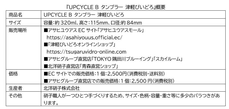 ・アサヒユウアスのECサイト「アサヒユウアスモール」と、「津軽びいどろオンラインショップ」、アサヒグループの外食店舗「TOKYO隅田川ブルーイング」「アサヒスカイルーム」で販売します。