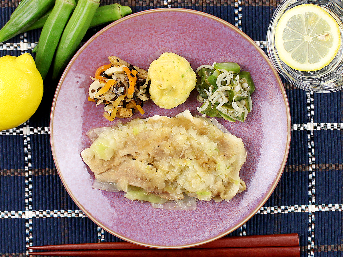 副菜は、ひじきの入った切干大根、チーズたらの天ぷら、しらす入りのおくらの和え物です。
