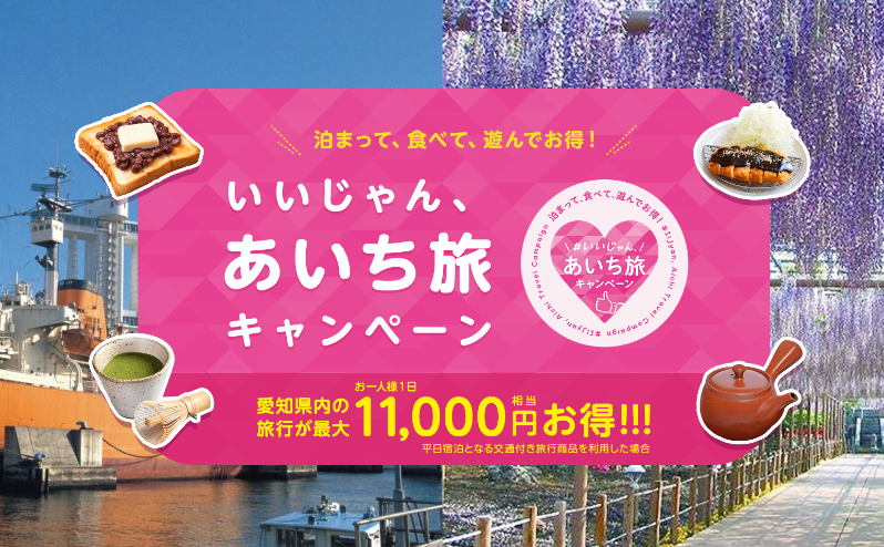 愛知県内の加盟宿泊施設に予約申込をして頂き、旅行代金の40%相当( 交通付旅行商品最大8,000円、交通付旅行商品以外最大5,000円)の割引と、地域限定クーポン(平日3,000円、休日1,000円分/キャンペーン対象者お一人様/1泊)が受け取れます。詳しくは事務局HPをご確認下さい。(© 2022 いいじゃん、あいち旅キャンペーン事務局 https://www.iijyan-aichi.jp/)