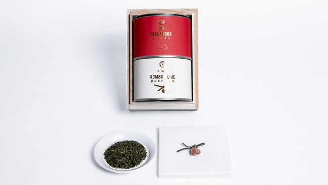 大きな「福」を呼びこむことを祈念し、金粉入りの「ふくみどり」シングルオリジンと、結び昆布と干し梅のセットを特別な紅白の縁起の良いパッケージにデザインし、福を逃さぬよう、気密性の高い桐箱に入れた最上級の贈り物です。