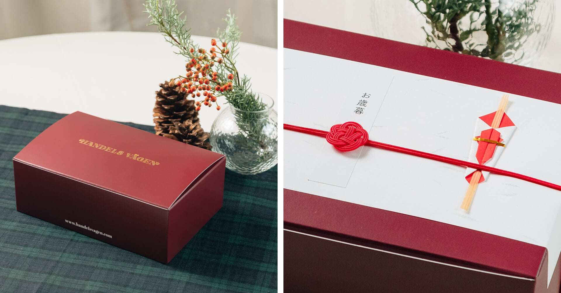 また、ハンデルスベーゲンでは用途に応じた有料・無料のギフトラッピングを数種類ご用意しておりますが、その中でも大変ご好評いただいているのが、本物の玉熨斗と梅結びの絹巻水引でお包みする熨斗サービスです。