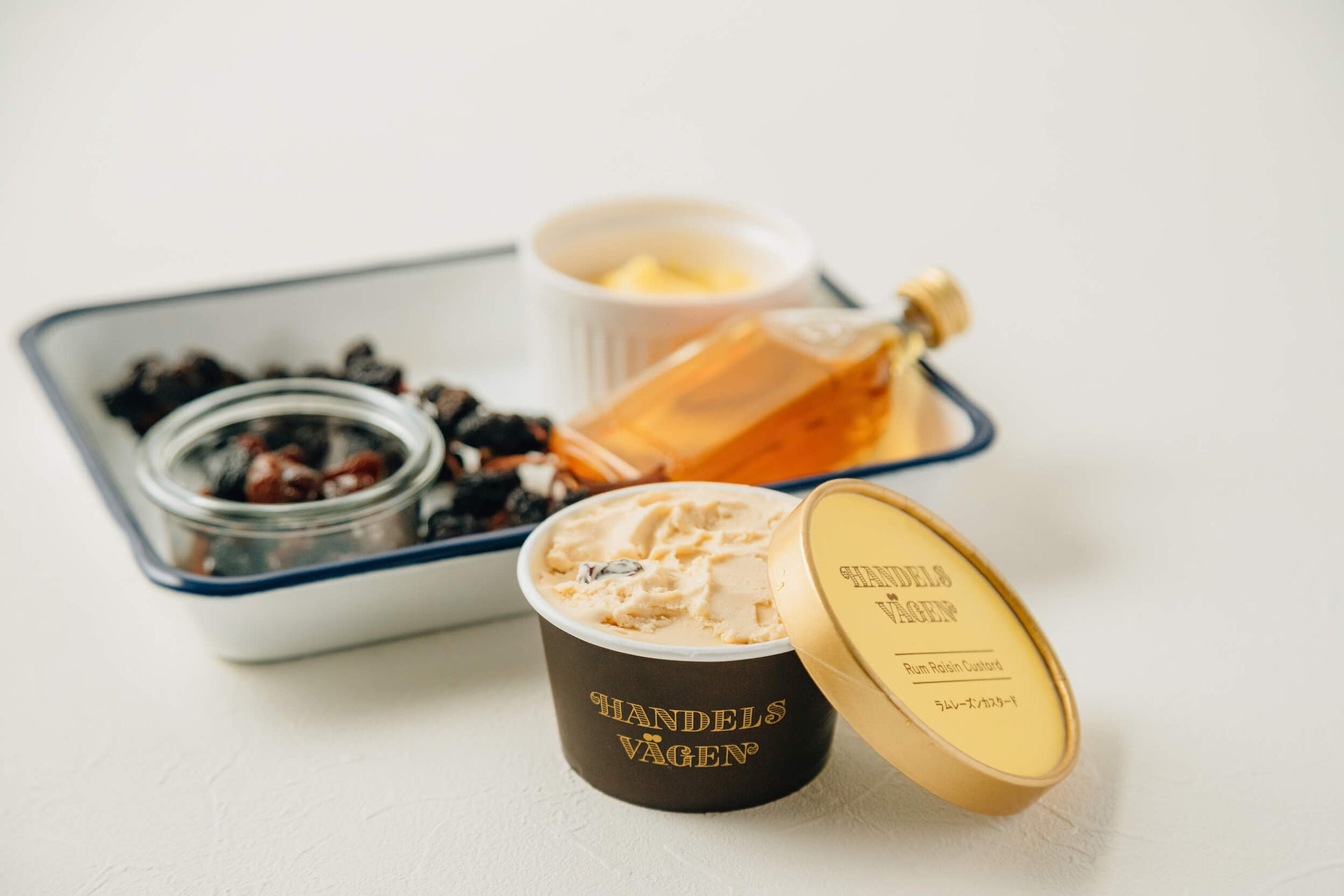 フランス産のジューシーなレーズンを、気品のある香りが特徴のフランス産ラム酒にじっくりと漬け込んだ自家製のラムレーズン。それを混ぜ込むアイスクリームは、イタリア伝統のカスタード「ザバイオーネ」をイメージし、数種類のマルサラ酒を独自にブレンドし味と香りのバランスを引き出したカスタードアイス。その二つが合わさることで「香り高いラムレーズンアイス」ができあがります。香料に頼らない芳醇な香りとシンプルで力強い味をお楽しみいただけます。