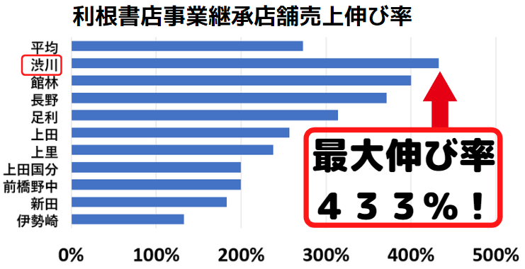 売上の伸び率は買収前から平均すると273%と非常に好調です。最大の伸び率は433%と大きく伸びております。2022年中に3店舗、2023年に6店舗を順次「利根書店」にリニューアル予定で、5年後に9店舗で年商10億円を目標とします。