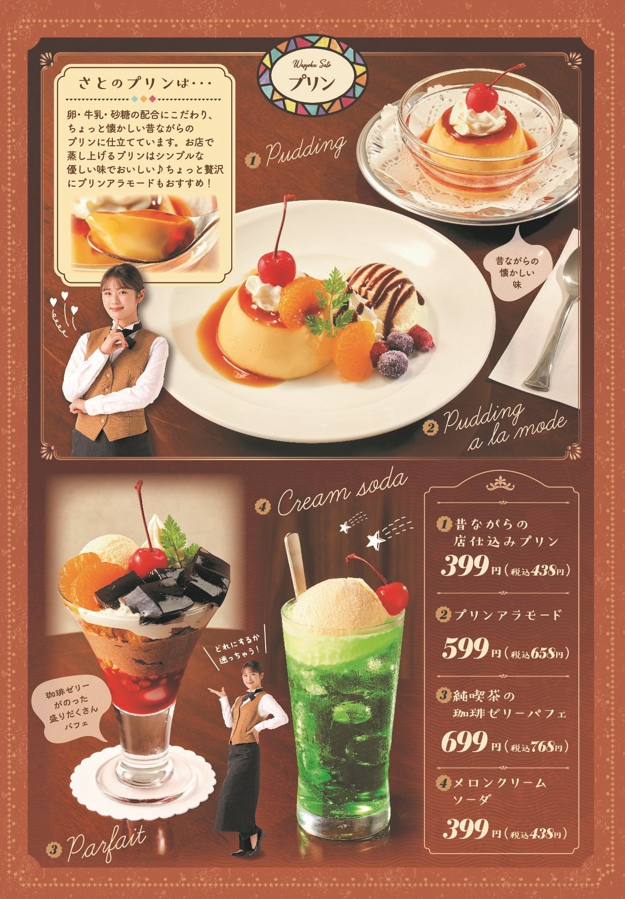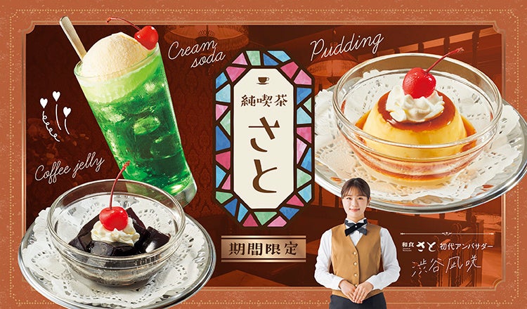和食さとと渋谷凪咲さんのコラボ企画「純喫茶さと」の昔懐かしいデザートで、思い出話に花を咲かせたり写真を撮ったりなど、是非、和食さとのお店で楽しいひとときをお過ごしください。