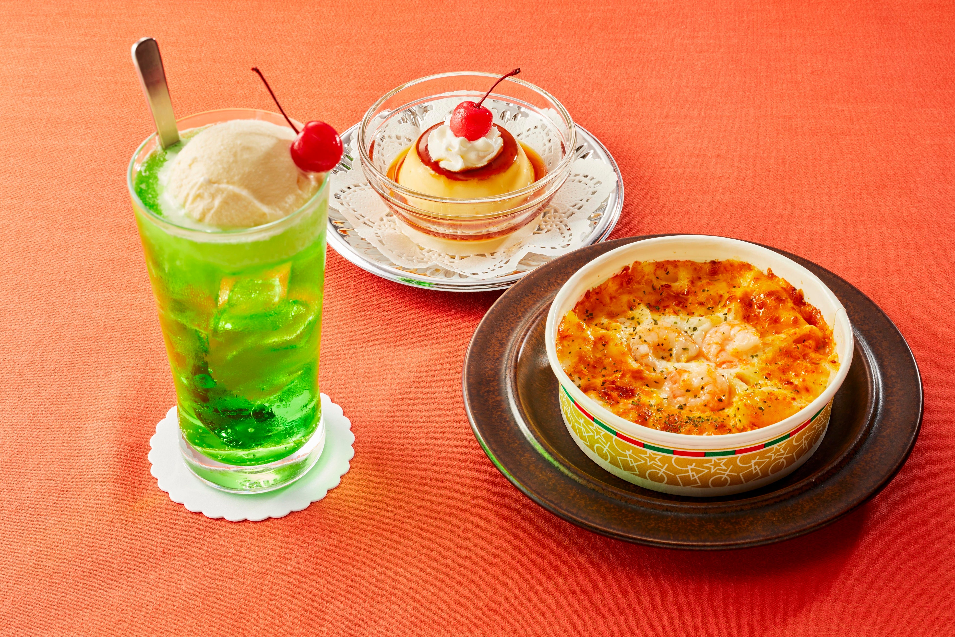 その他にも、さくらんぼを添えた「メロンクリームソーダ」 399円(税込438円)や、軽食メニュー「海老グラタン」 499円(税込548円)や、「ビーフシチュードリア」 599円(税込658円)もご用意しているのでデザートと一緒にお楽しみいただけます!!