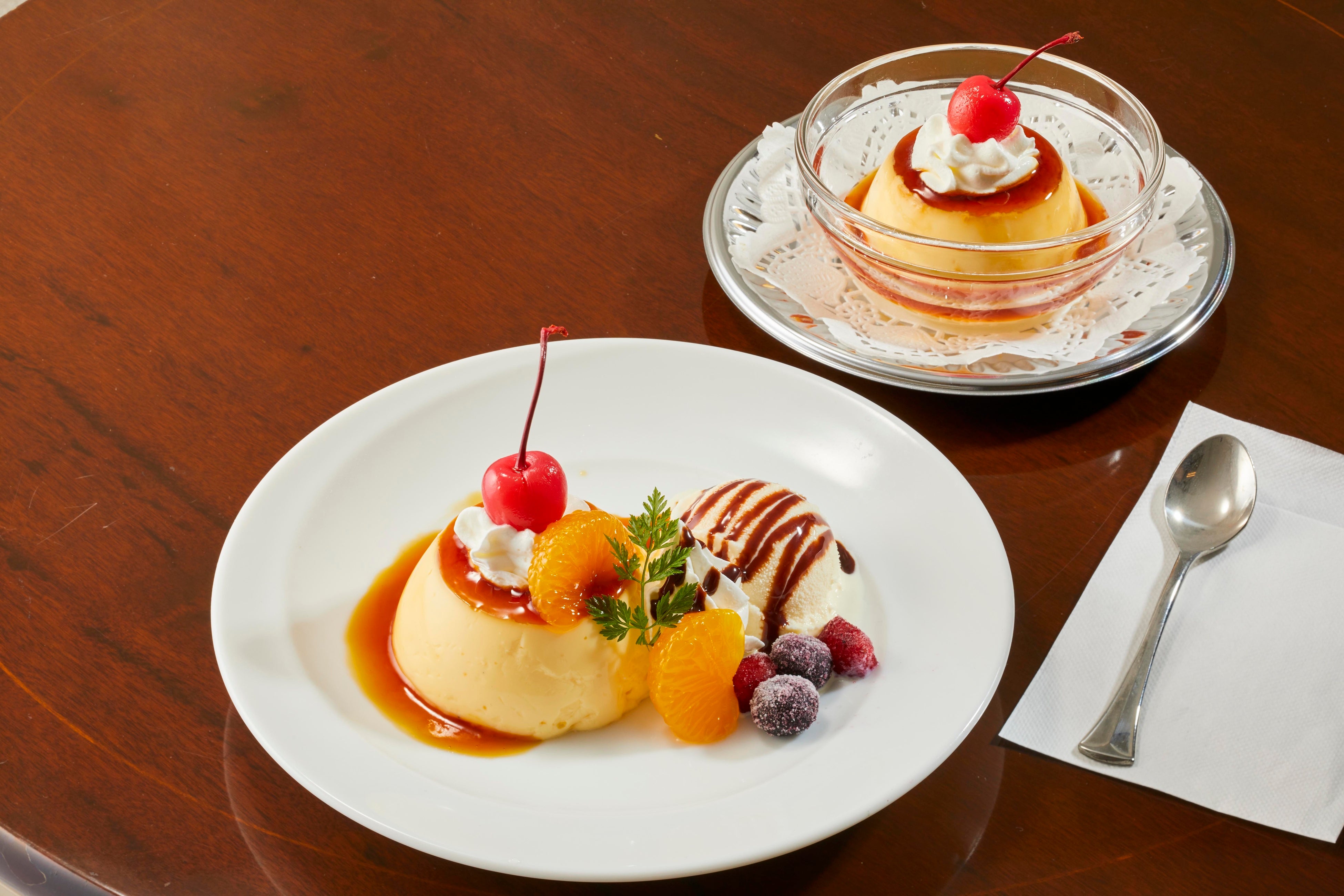 昔ながらのちょっと固めのプリンに、バニラアイスやホイップクリーム、さくらんぼ、みかんなどを添えた、懐かしくもありちょっと贅沢なプリンアラモードです。