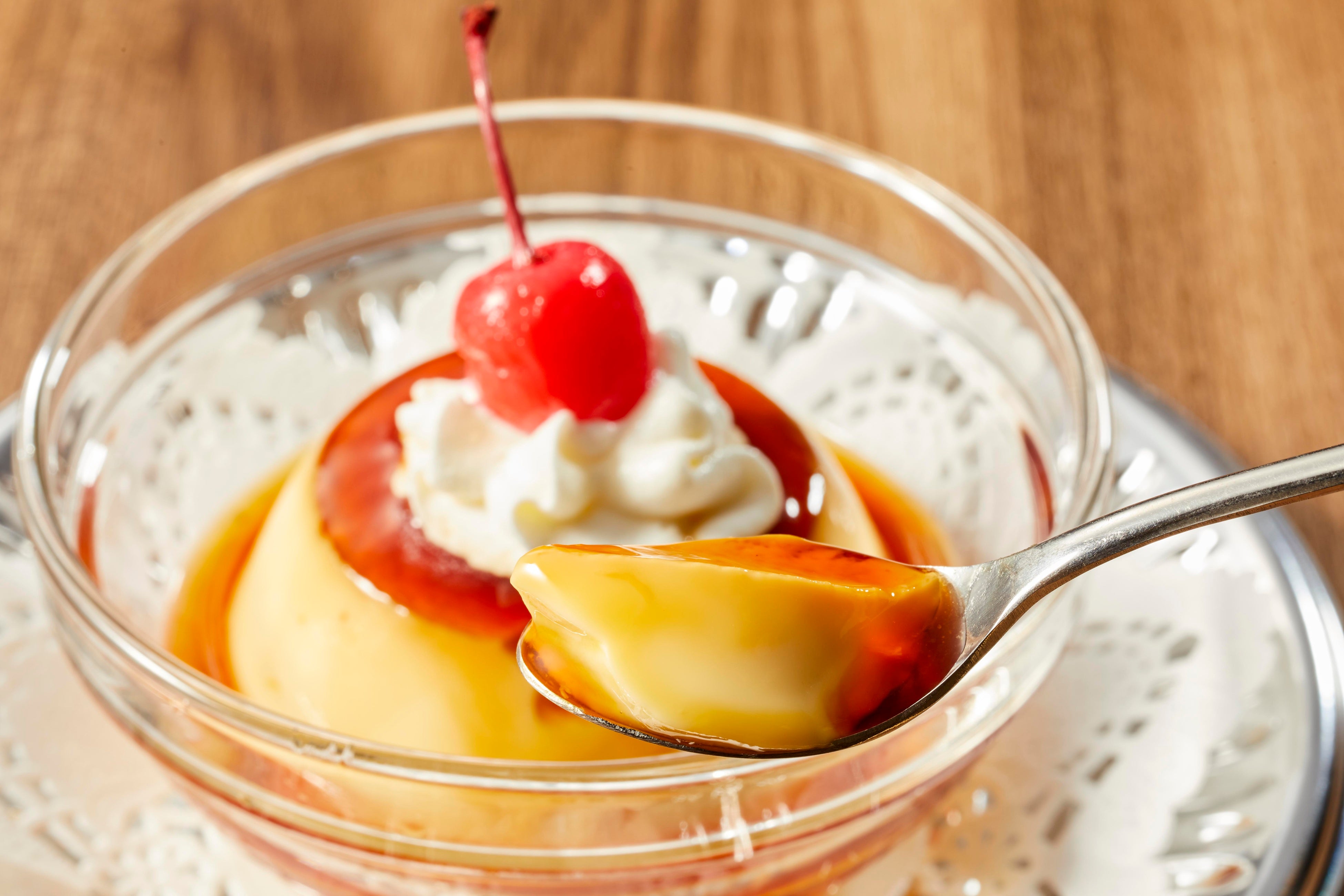 ホイップクリームの上に赤いさくらんぼがのったシンプルなプリンは、見た目も可愛くてレトロを感じるということで渋谷さんも太鼓判のデザートです。