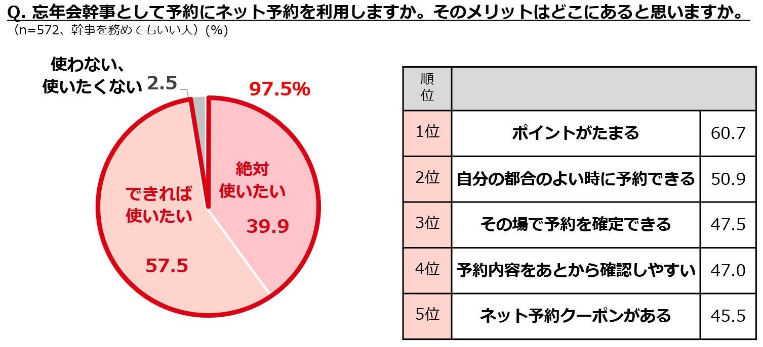 忘年会の予約は97.5%と大多数がネット予約を利用することがわかりました。またそのメリットについては、利便性やポイント・クーポンといったお得感が上位5位を占める結果となりました。