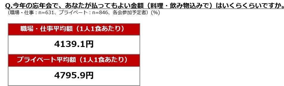 忘年会の平均予算については、職場よりもプライべートの忘年会のほうが高く、4795円と656円のプラスになりました。