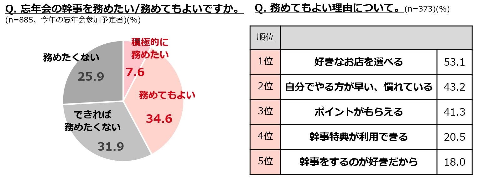 忘年会の幹事について、務めたい・務めても良いを合わせて42.2%となりました。その理由は「好きなお店が選べる」「自分でやる方が早い」「ポイントがもらえる」が上位となっています。一方で、務めたくないと回答した方でも、ポイントがもらえるとしたら38.8%が幹事を務めたい・務めてもよいと回答しました。