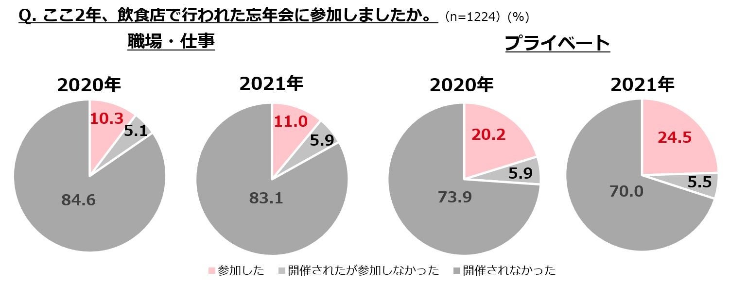 新型コロナウイルス感染拡大を背景に、ここ2年の忘年会の参加率は職場で約1割、プライベートで約2割でした。一方で感染がおさまっていたら今年の忘年会は職場で50.7%、プライべートで67.9%が参加すると回答しており、3年ぶりの忘年会として参加意向の高まりがうかがえます。
