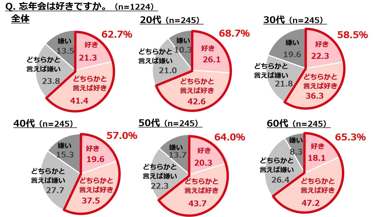 ①忘年会「好き派」が多数。20代が最も好きな傾向。