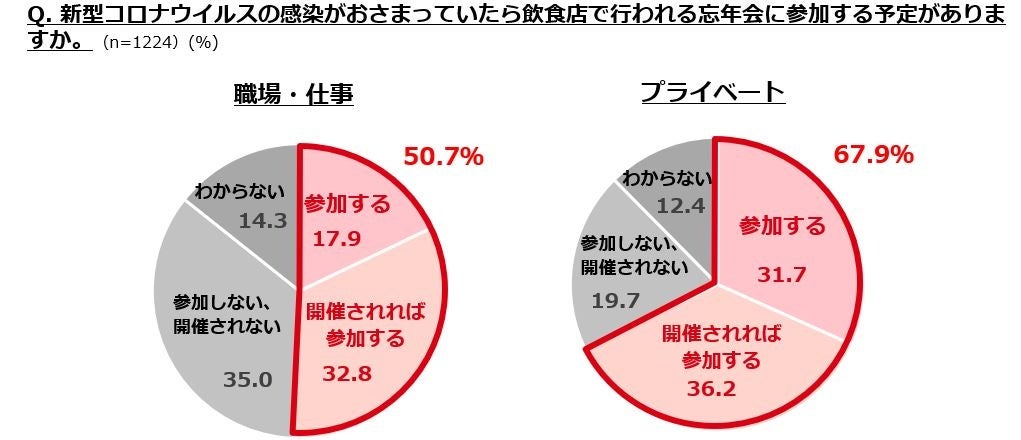 今年の忘年会の参加予定はコロナがおさまっていたら職場で50.7%、プライベートで67.9%。
