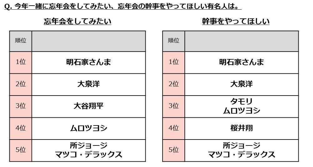 一緒に忘年会をしたい有名人も、忘年会の幹事をやってほしい有名人もどちらも1位は明石家さんま。
