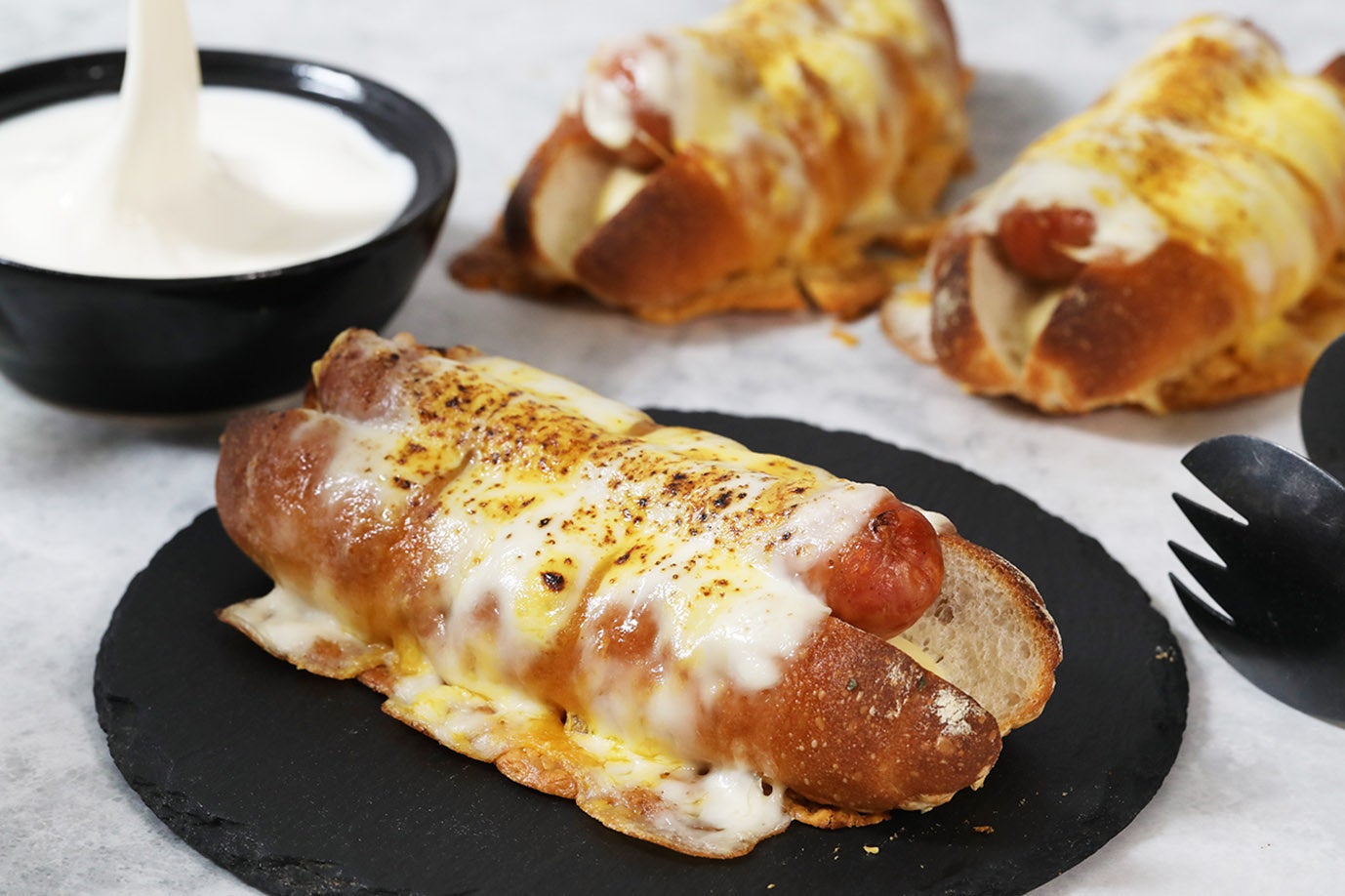 - シュレッドチーズの上にフランス生地のドッグをのせ、ソーセージとカマンベール風のチーズを挟み、チーズソースとチェダーチーズをのせて焼き上げました。下も上もチーズづくしでチーズの旨味が口の中で広がります。