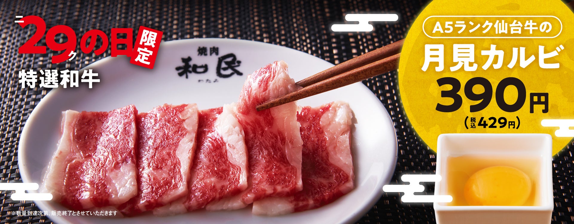 是非この機会に「肉の日」限定の「A5ランク仙台牛の月見カルビ」をお召し上がりいただくとともに、毎月29日の “肉の日”にはコスパ抜群の「焼肉の和民」へお立ち寄りをください。
