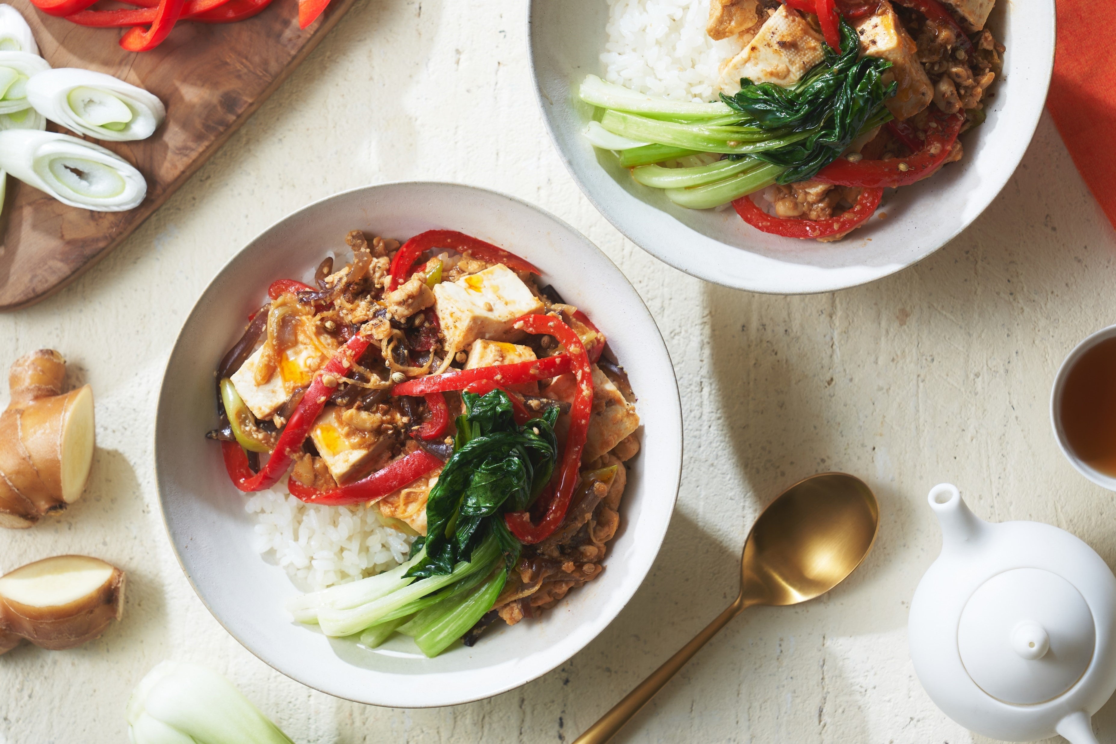 商品説明:炒めた長ねぎやしょうがが香るヴィーガン麻婆豆腐は、ナッツとスパイスが混ざったデュカを振ってアクセントに。スパイシーな香りに食欲そそられる仕上がりです。