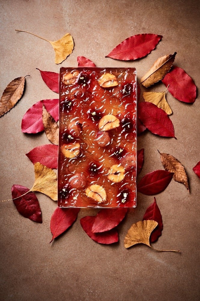 パティシエールのカレン・ソウが立ち上げたアトリエ「and so on」が大人の時間を演出するために創作した「ハコジュレ」。透明感あふれる小さな「ハコ」の中で完成されるジュレの世界。ヘーゼルナッツ香るジュレ、カシスの果実味が凝縮された芳醇なジュレ、赤ワインのビターなジュレの3種類のジュレのマリアージュと旬の渋皮栗のコンポートのほっくりとした美味しさとともにお楽しみください。