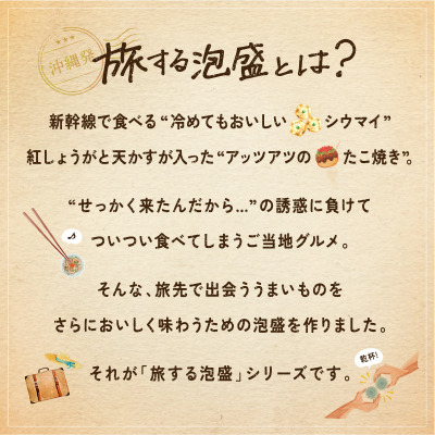 「旅先で出会ううまいものをさらにおいしく楽しむためのお酒」をコンセプトに日本各地のご当地グルメに合う泡盛を造ったのが「旅する泡盛シリーズ」。第1弾の「旅する泡盛 横濱」を皮切りに、第2弾・第3弾と実際に旅をしているような気持ちで日本中を飛び回ります。