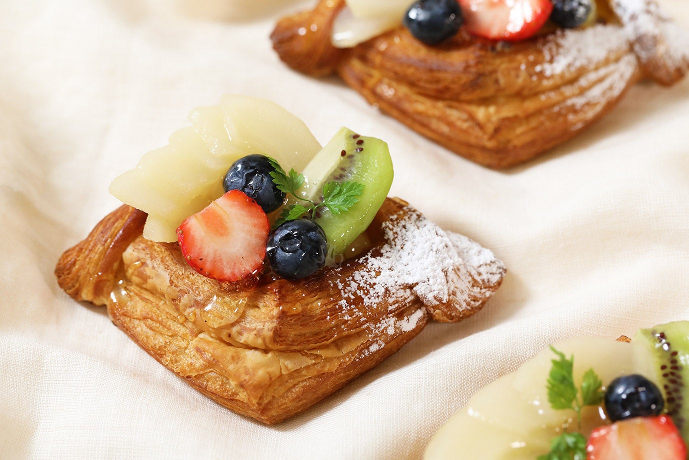 一度に4種類のフルーツを味わえる贅沢なデニッシュ。果実の旨味をデニッシュやカスタードクリームと合わせて心ゆくまでお楽しみください。