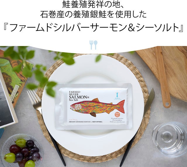 産地である利点を活かし、水揚げから製品化まで一度も原材料を冷凍しないノンフローズン製法を実現し、魚の本来の旨味や栄養価をそのままにレトルトパックを製造しています。味付けはツナ、サーモンともに松島湾産の藻塩のみで、油脂や保存料等の添加物を使用していません。健康志向やエシカル消費ニーズに呼応する製品として高い評価を受けております。