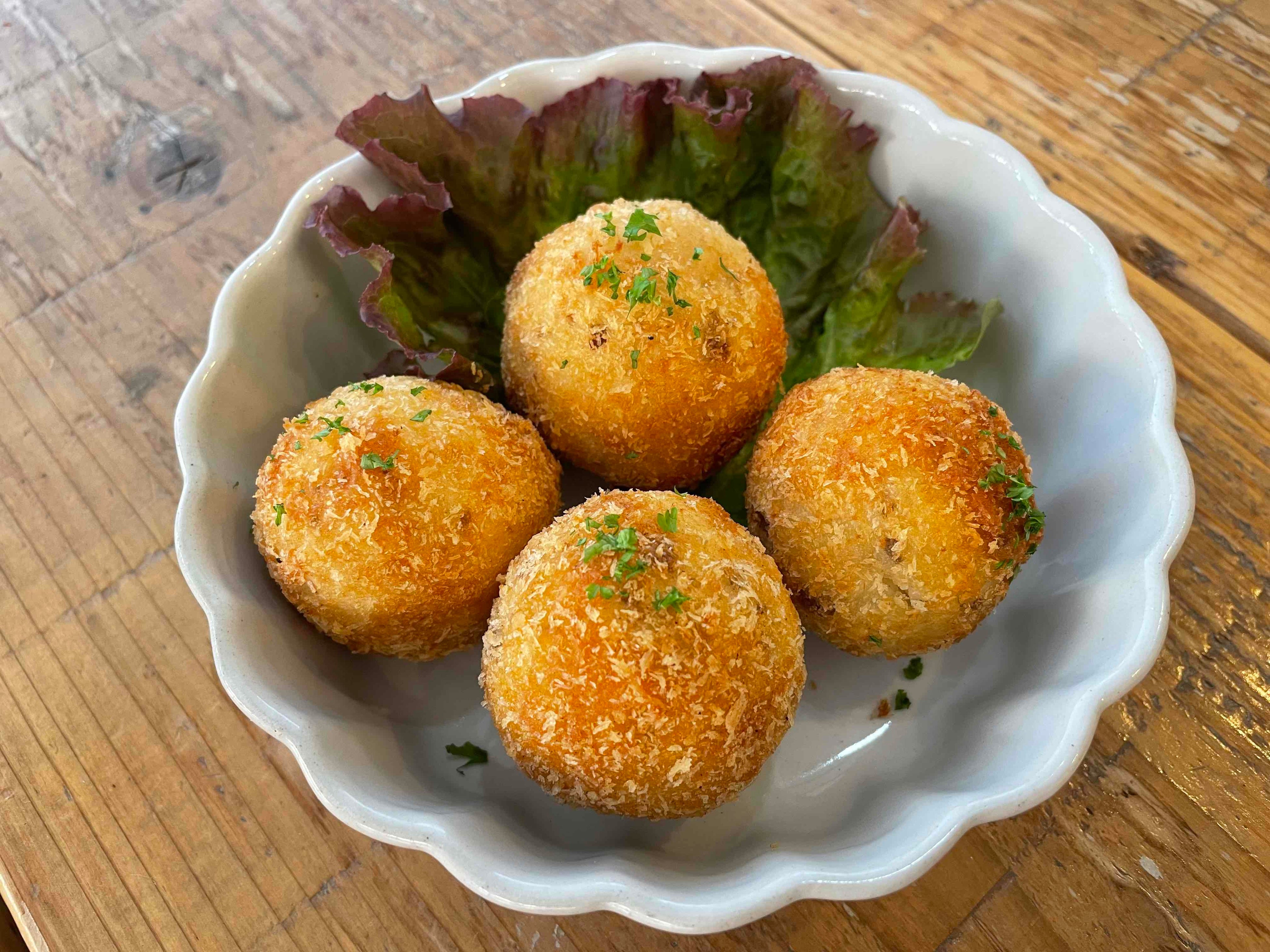 新鮮なジャガイモをほっくりとゆでて、しっかり目に味付けしたひき肉と玉葱を加えて菜種油でからりと揚げました。