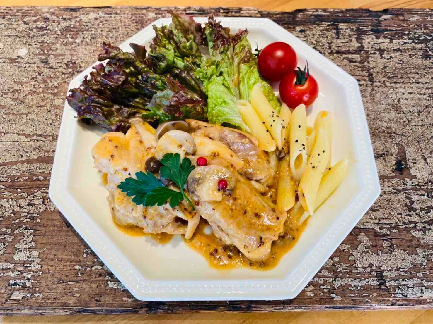白ワインビネガーとブランデーを使用し、じっくり煮込んだ鶏肉は、コクがあり柔らかくてジューシー。