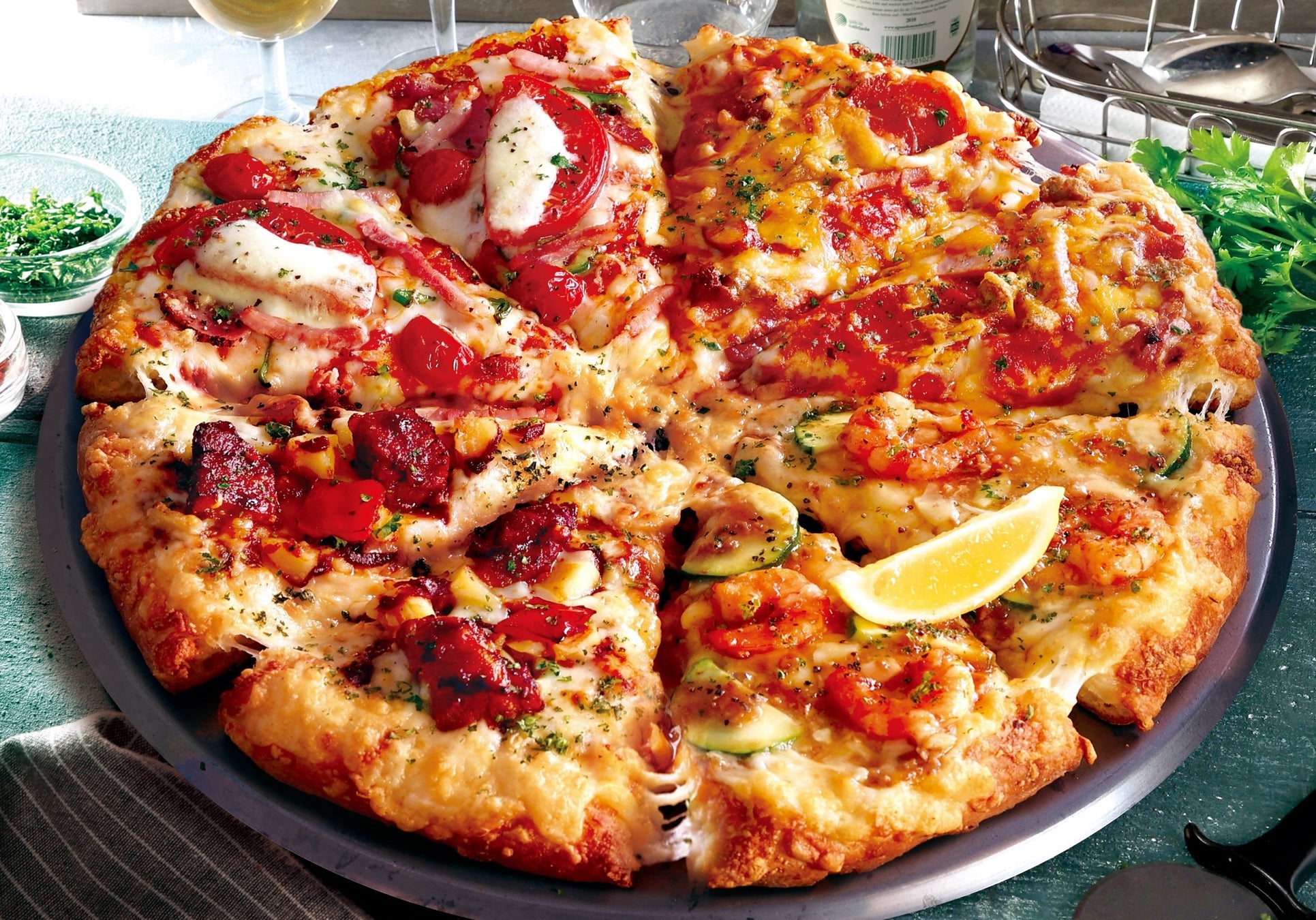 内容:カニとオマール海老ソースの贅沢ピザ、とろけるモッツァの贅沢マルゲリータ、テリヤキチキン、マスカルポーネと熟成サラミ